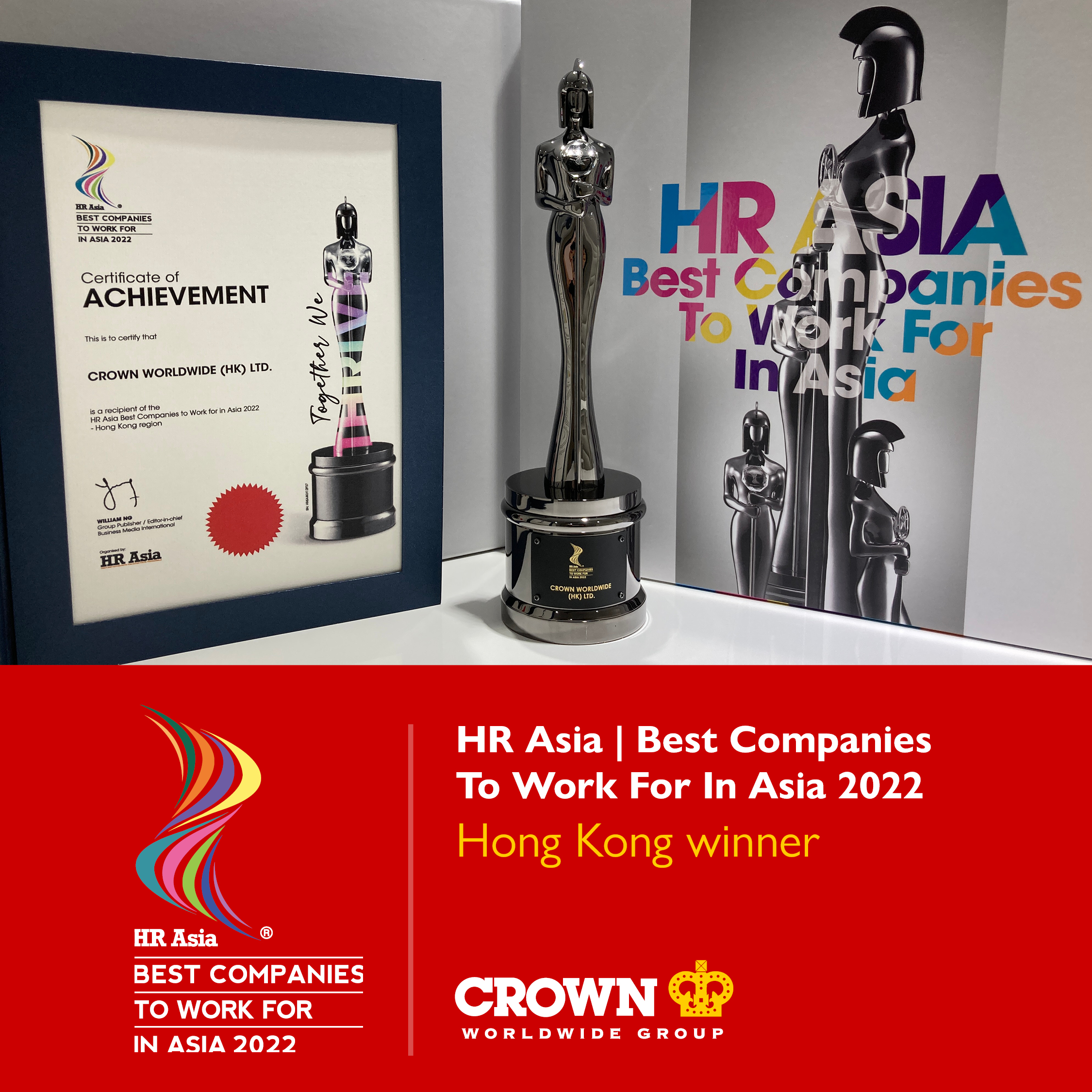 HONG KONG SAR - Media OutReach - 1 December 2022 - Crown Worldwide Group Hong Kong has won the HR Asia Best Companies to Work for in Asia 2022.