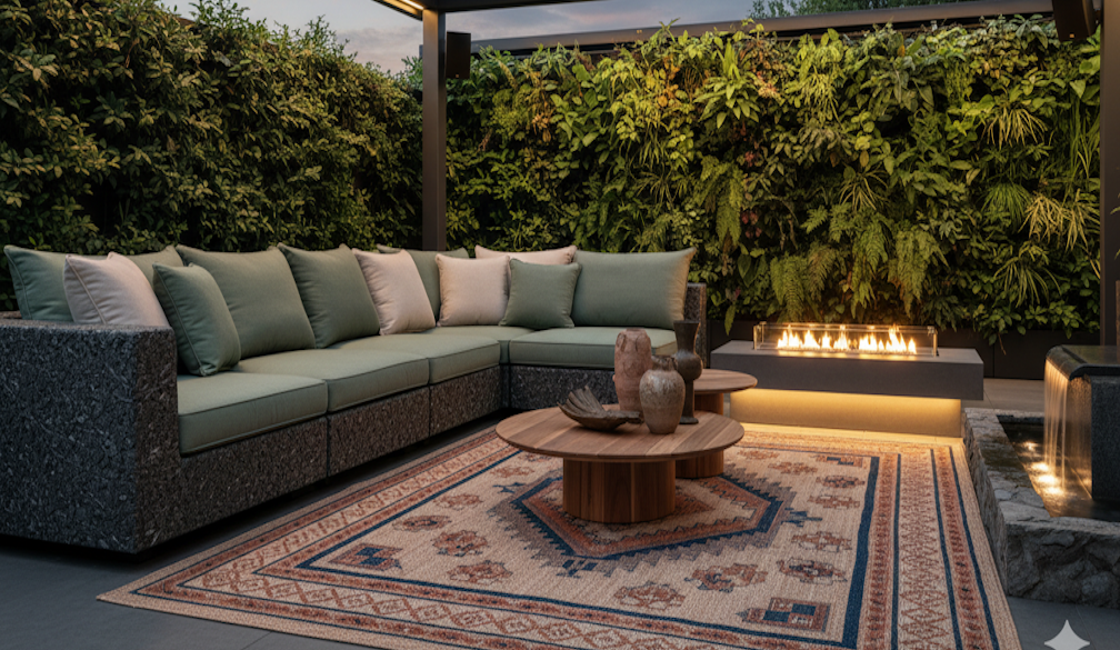 - Outdoor rugs to define lounge zones