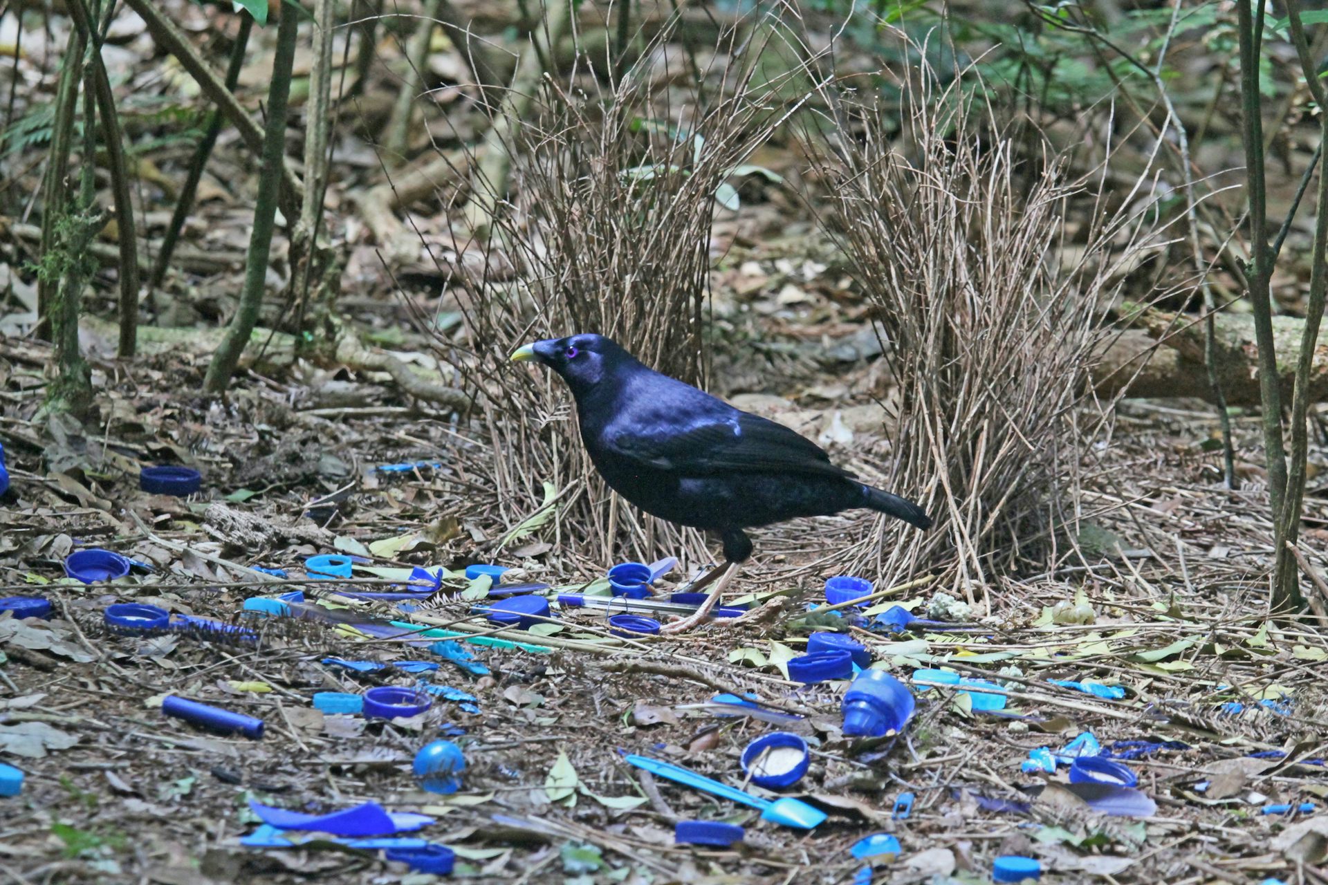 Male bowerbirds construct a bower (two parallel walls of sticks) in which they display a selection of items designed to tempt females. These gifts can include leaves, shells, feathers and flowers and bits of glass and plastic.
